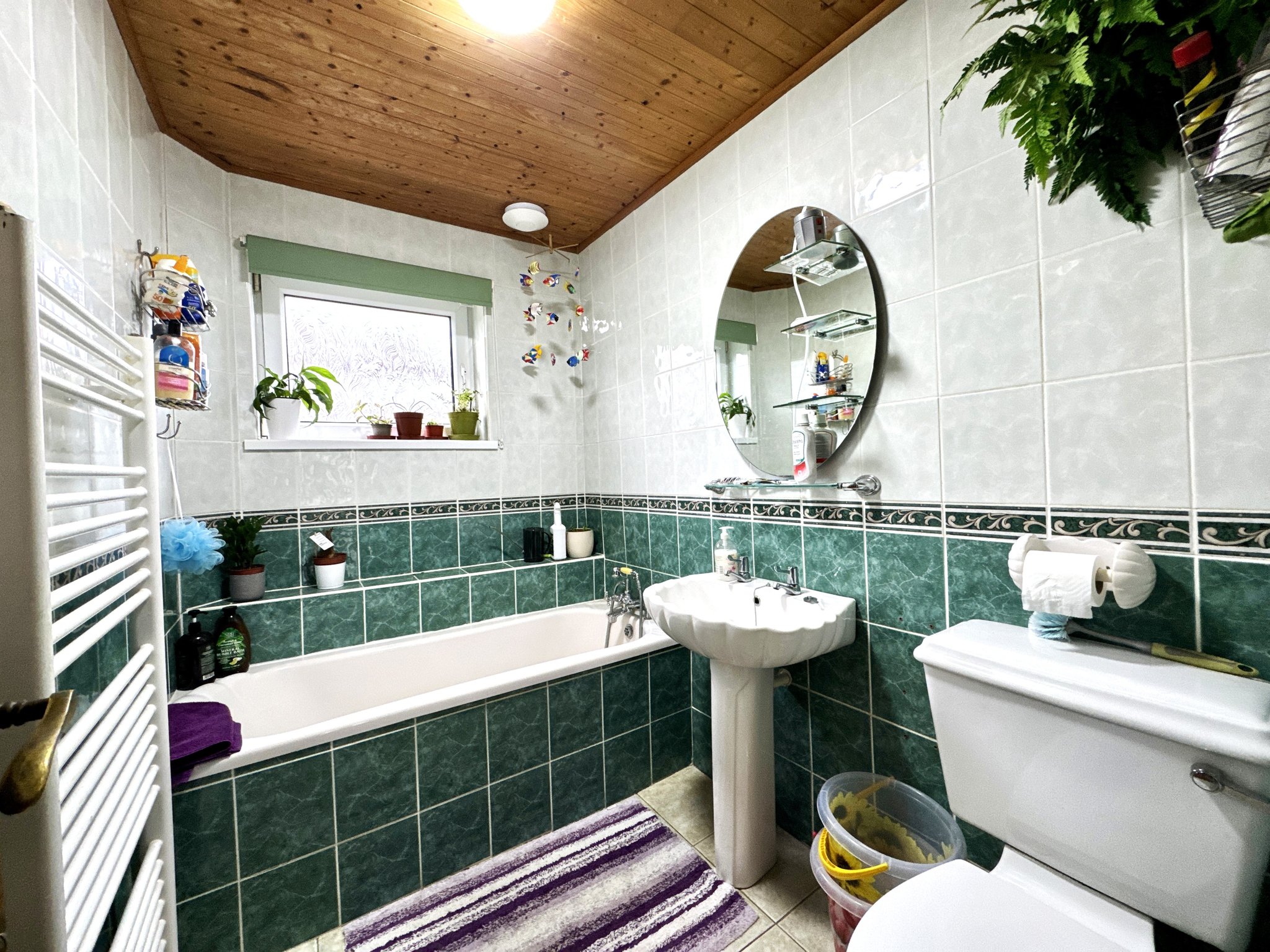 Laminate flooring, tiled walls. heated towel rail, extractor fan.