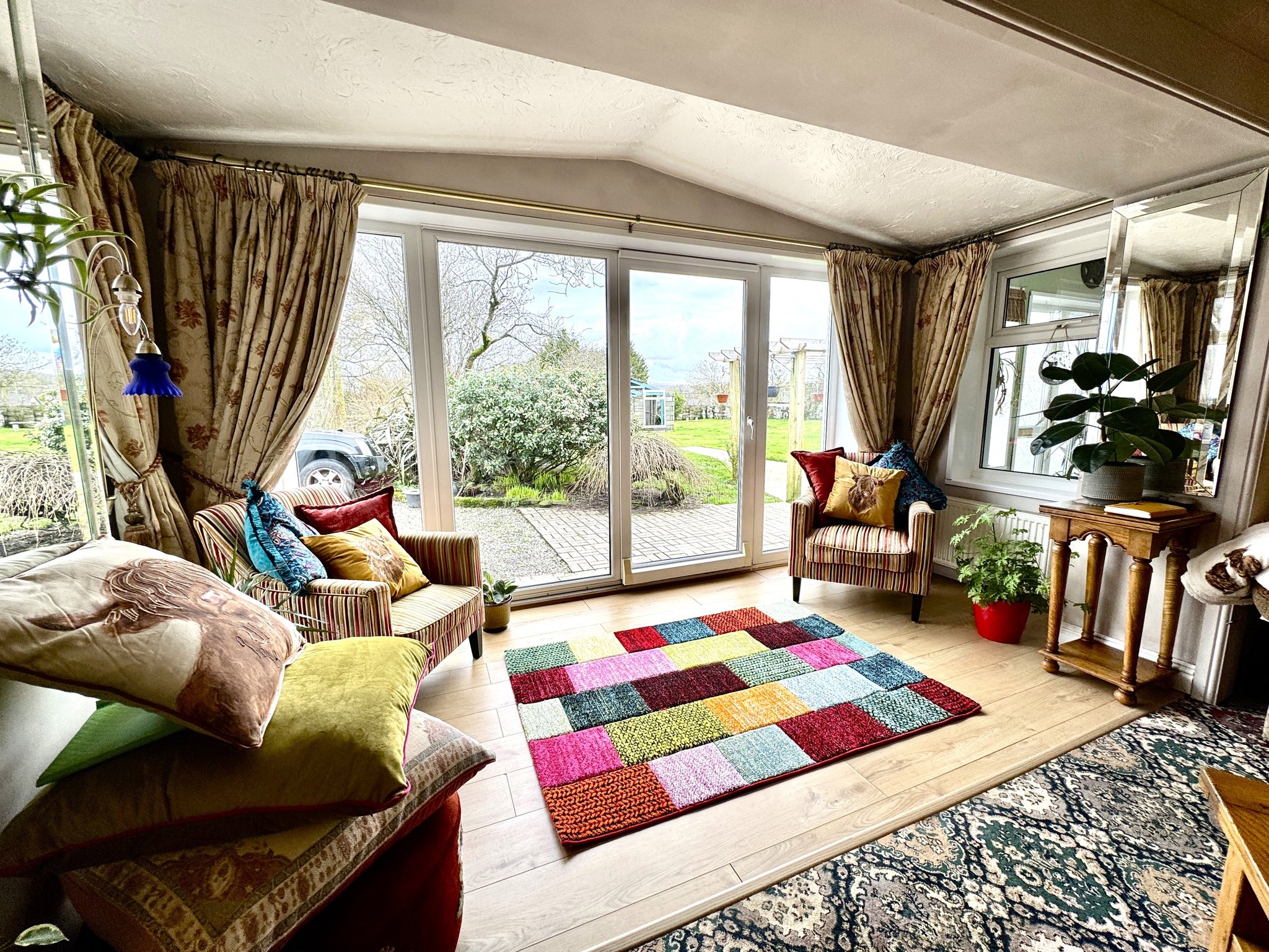 Spacious open-plan living room into bay window nook creating a sunroom with French doors to front
