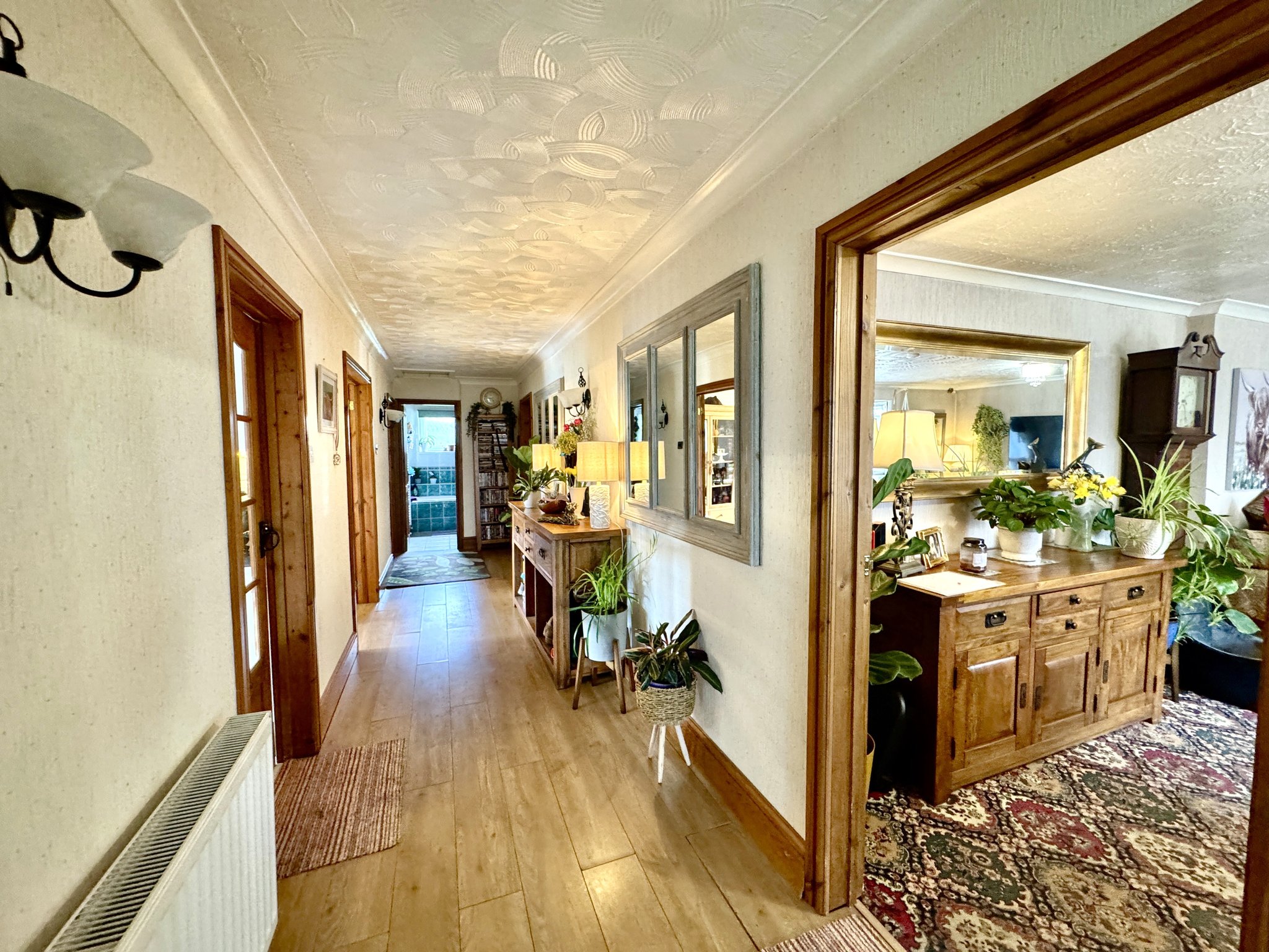 Wide spacious hallway serving the main living areas. Oak effect laminate flooring, wall mounted lights