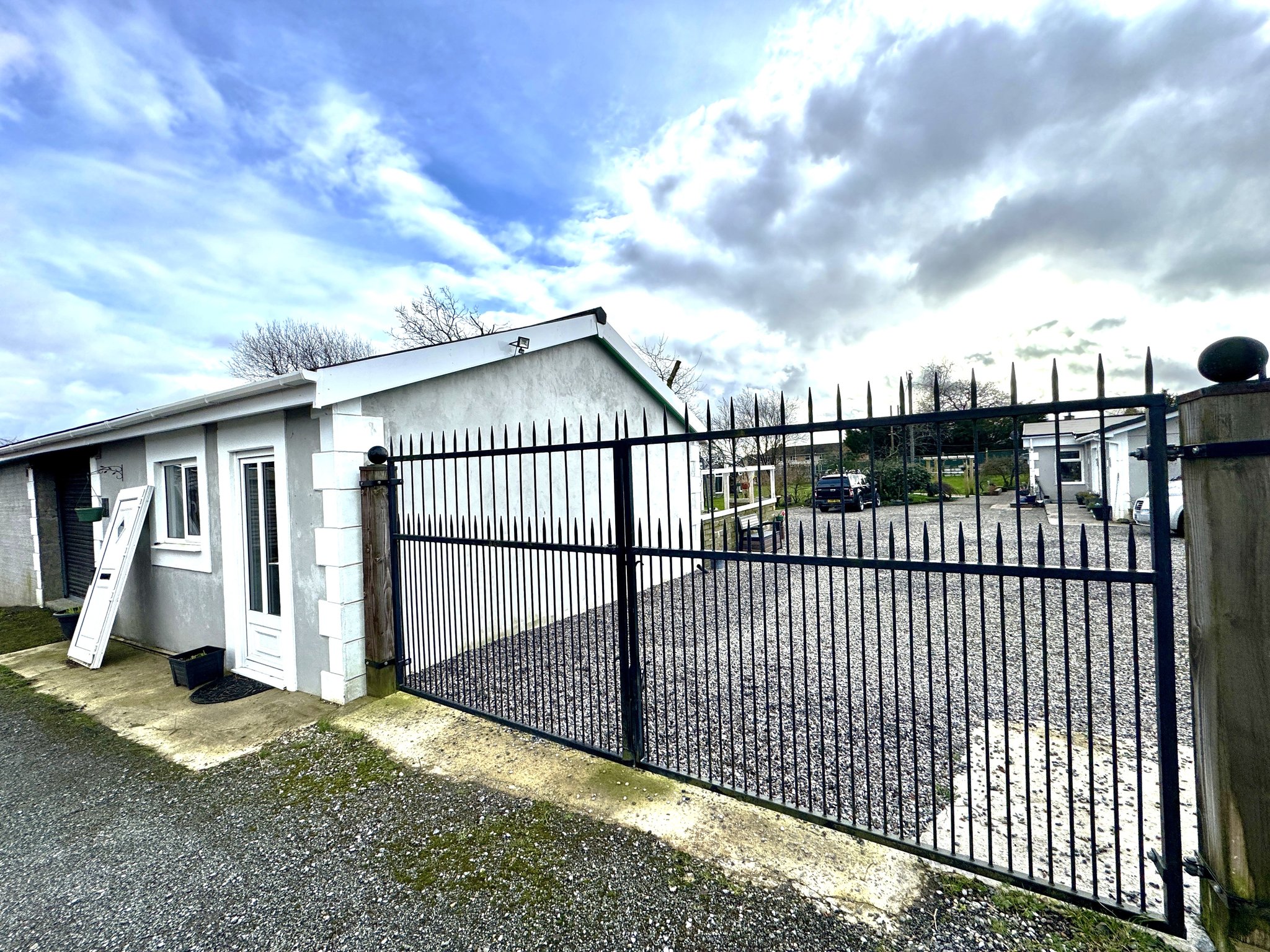 To the side of the bungalow, an additional gated gravel driveway provides further parking and turning space. This section is securely fenced and gated, creating clear separation from the stable block and yard areas.