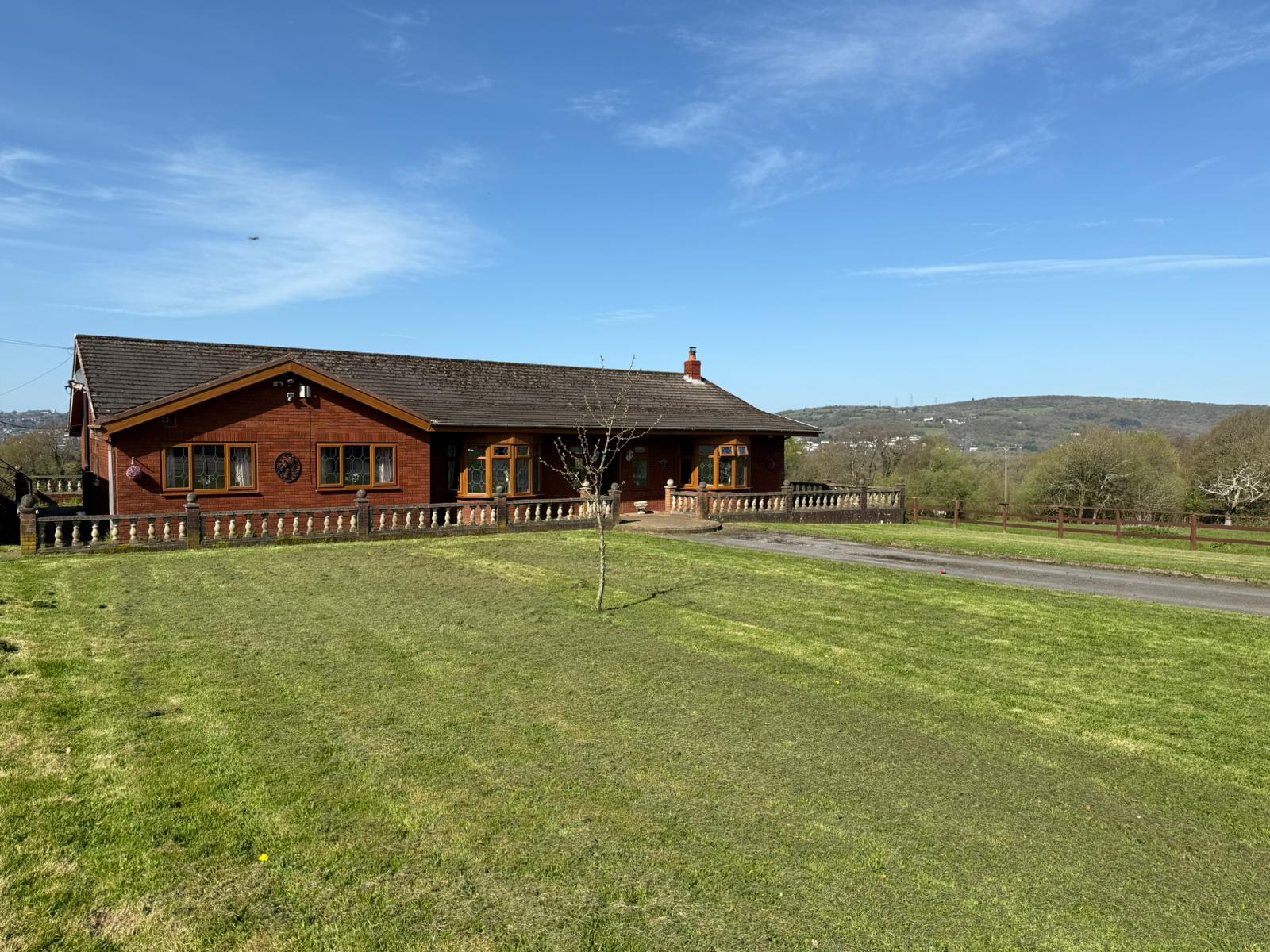 Paviour surround to property with stone ballistrade walling. Lawned garden divided by tarmacadamed driveway