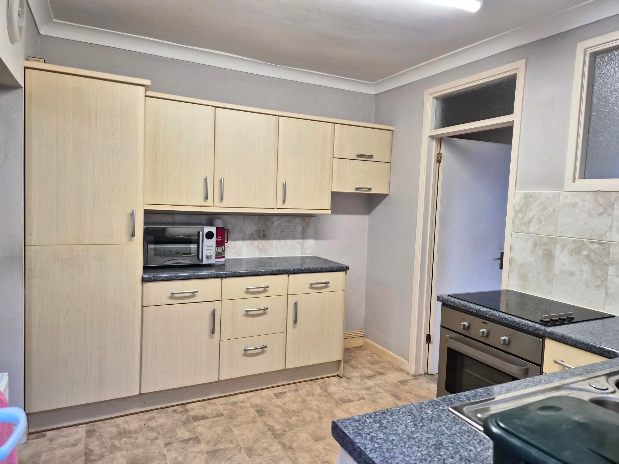 2.86m x 2.71m (9' 5" x 8' 11") Base and wall units. Integrated electric cooker and hob. Stainless steel sink. Lino floor. Radiator. Window to side. Door to rear garden.