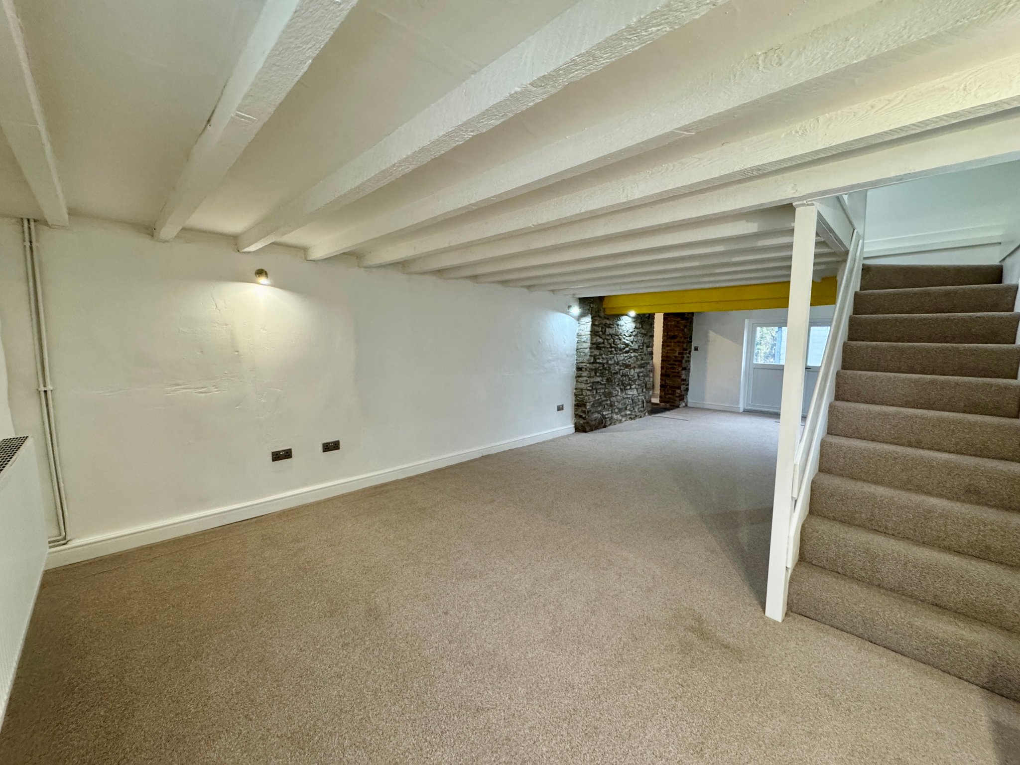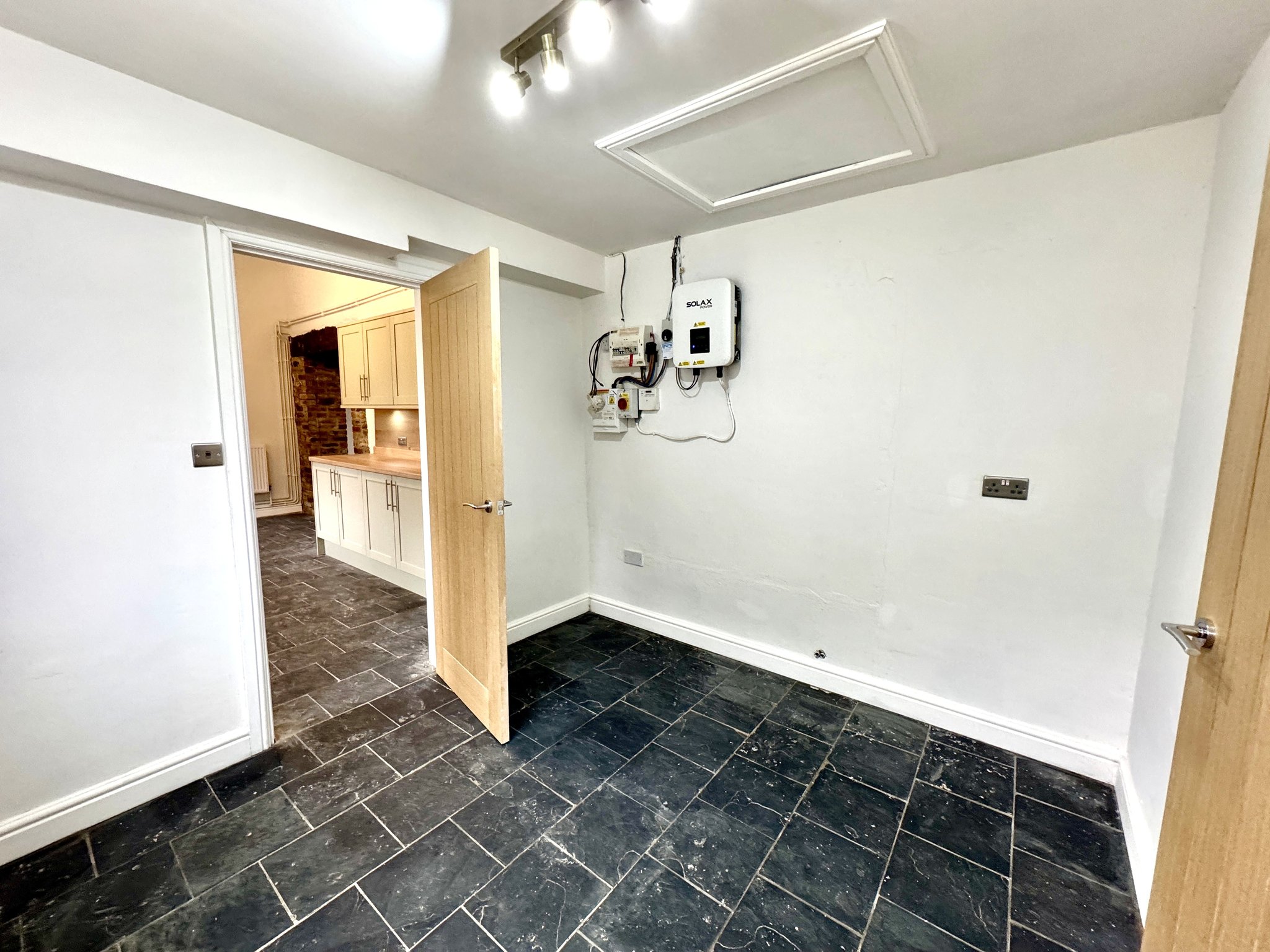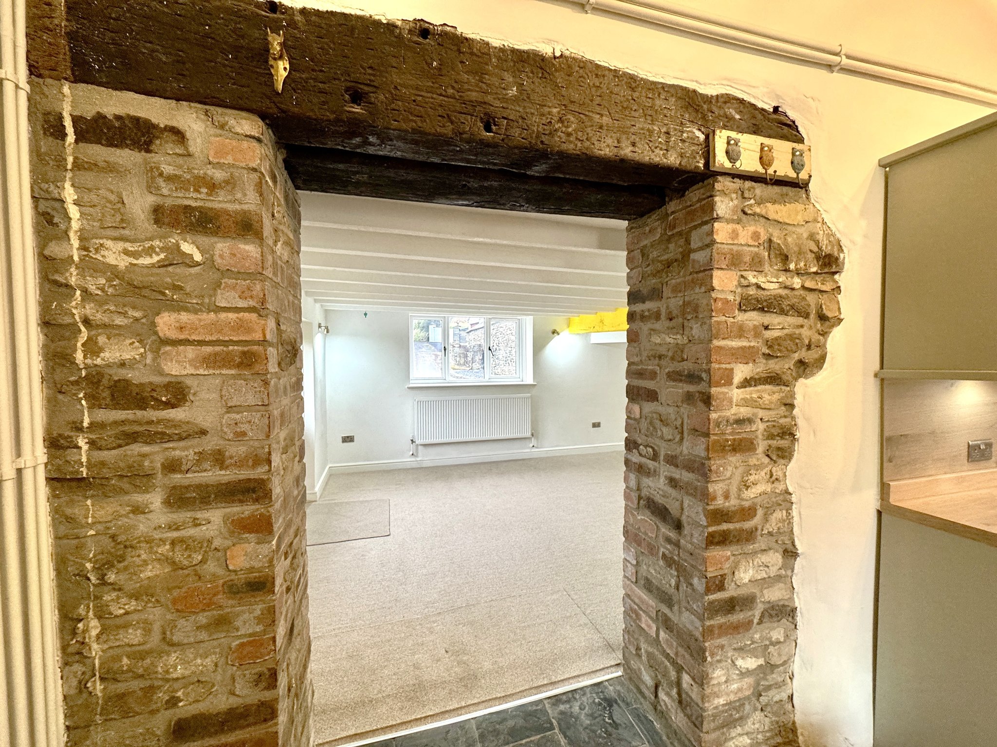 Large reception room with original beams and carpet flooring. Stable style doors to front and rear with windows to side. 2 radiators. Staircase to first floor. Archway leading into kitchen – breakfast room.