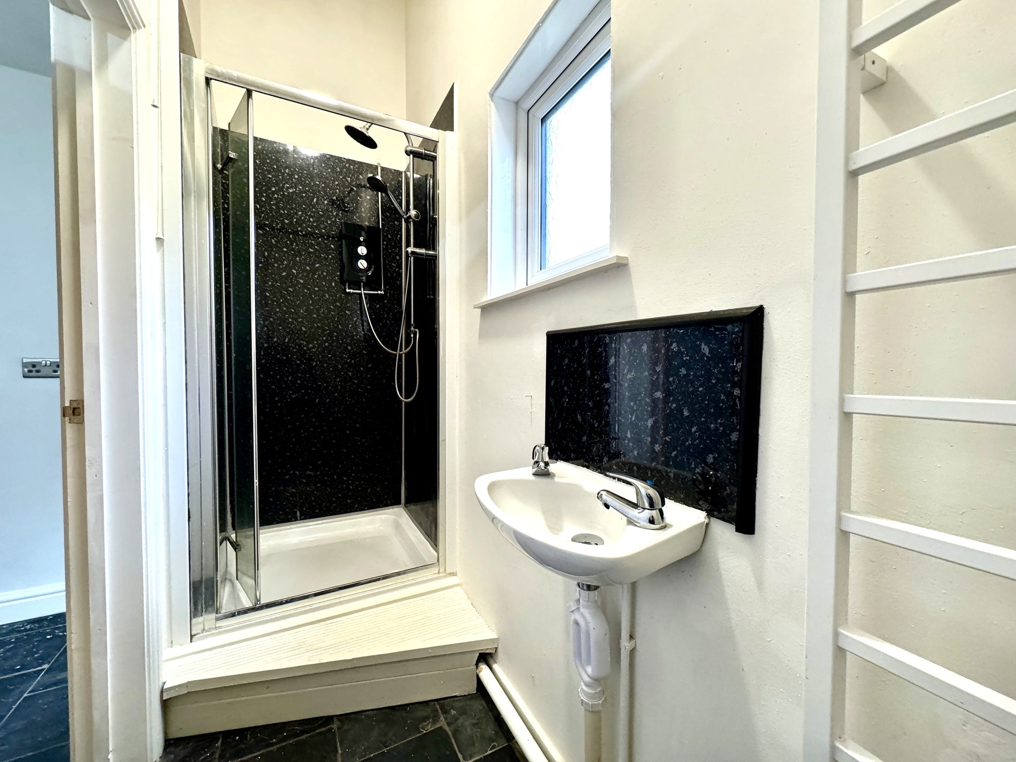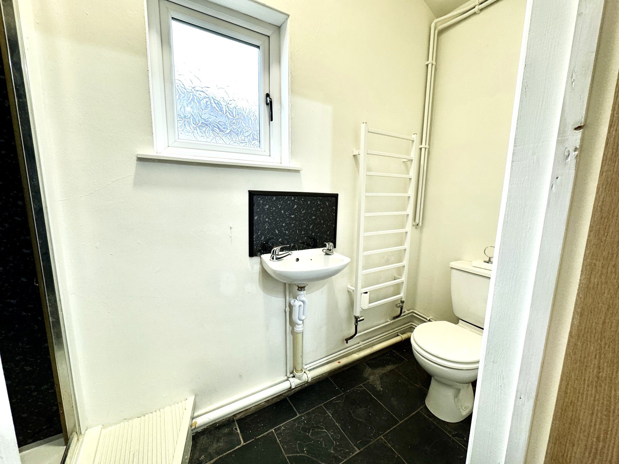 WC. Wash hand basin. Shower cubicle with electric power shower. Towel rail. Window to rear. Tiled flooring.