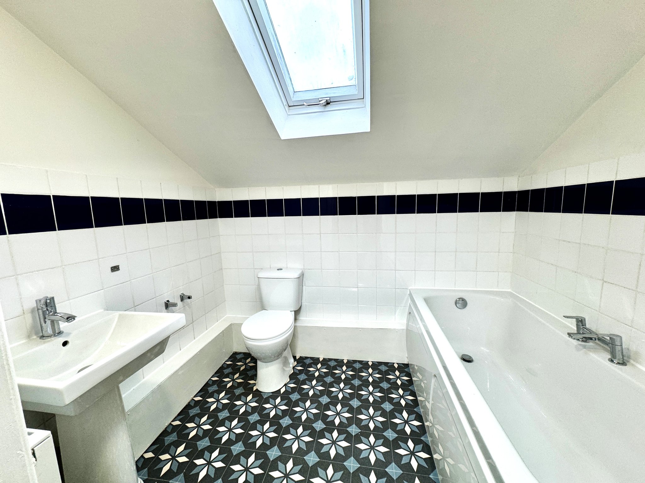 Bath tub. WC. Wash hand basin. Extractor fan. Tiled flooring. Radiator. Skylight.