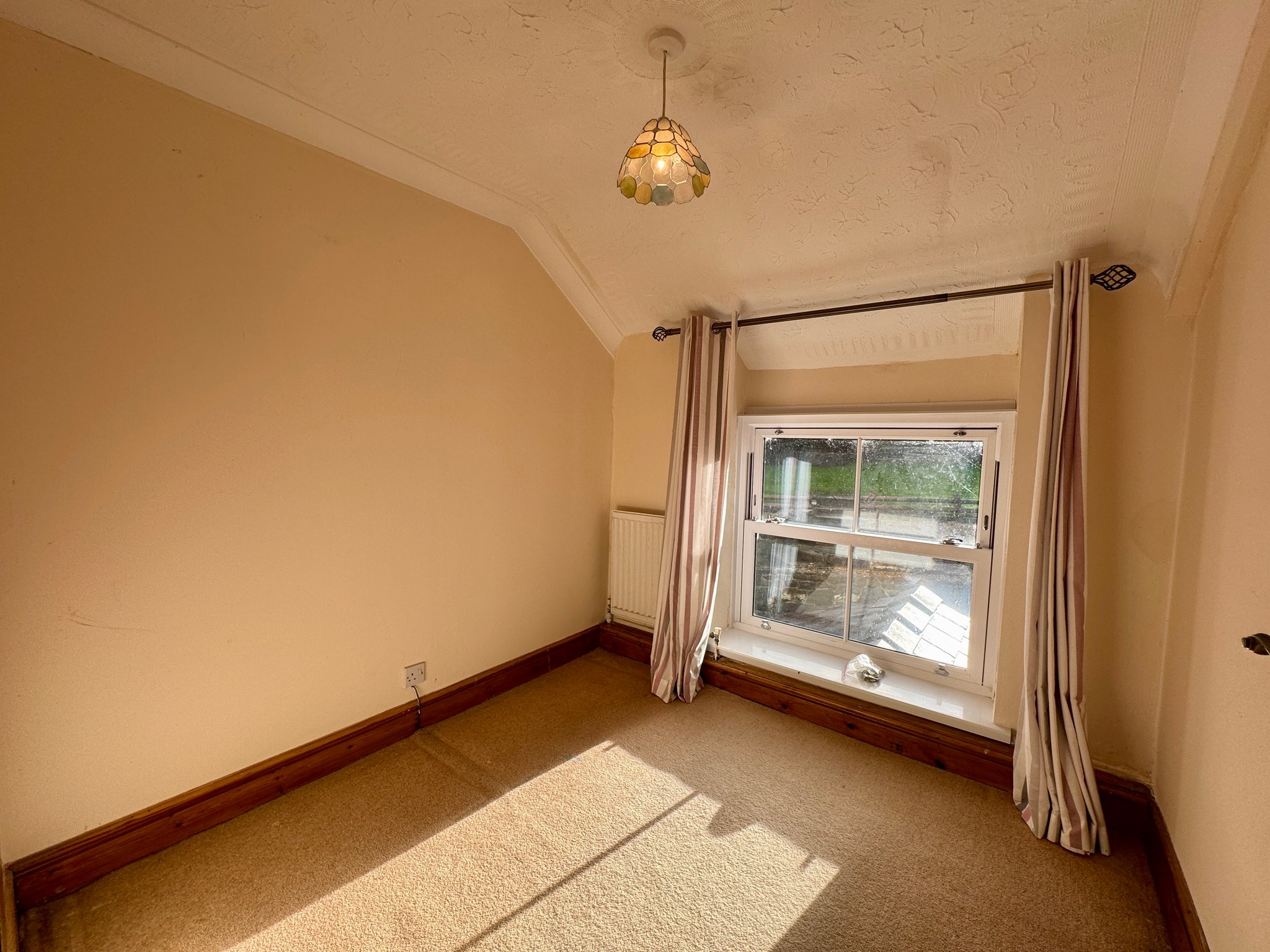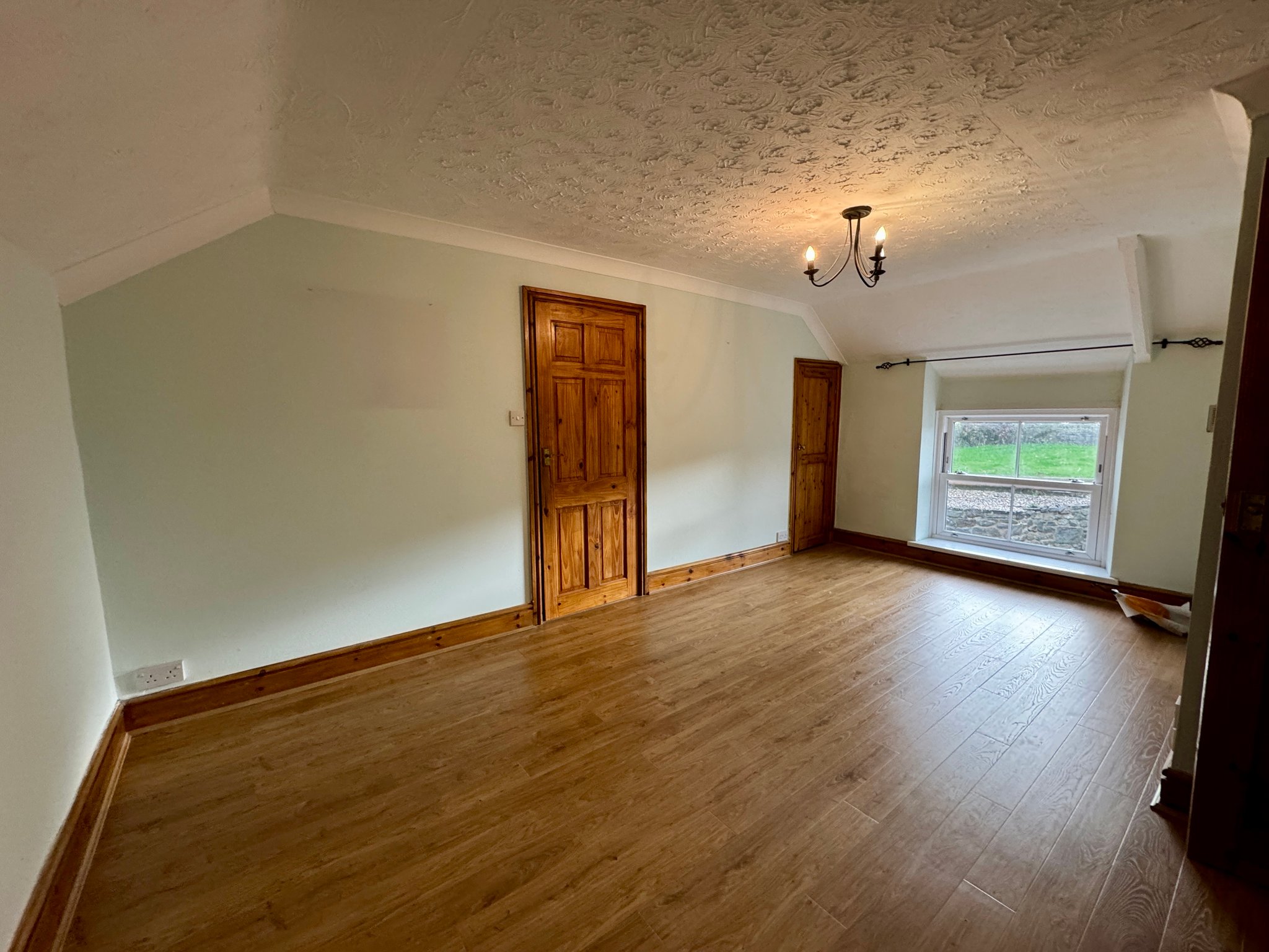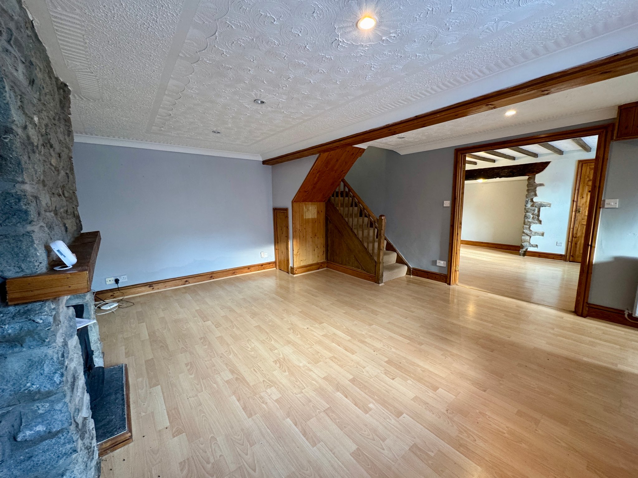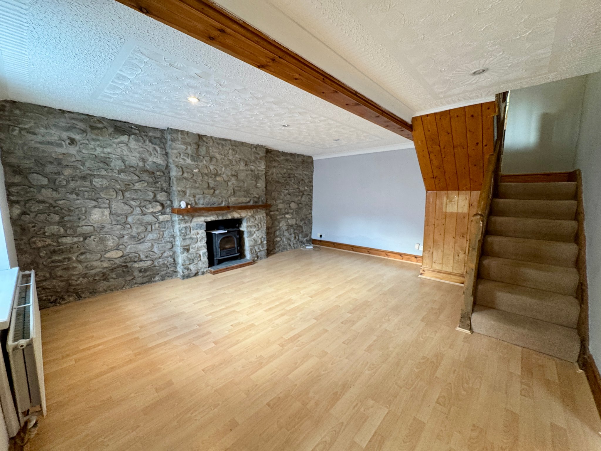 With feature stone wall with log burner and mantel over. Window, 2 radiators.