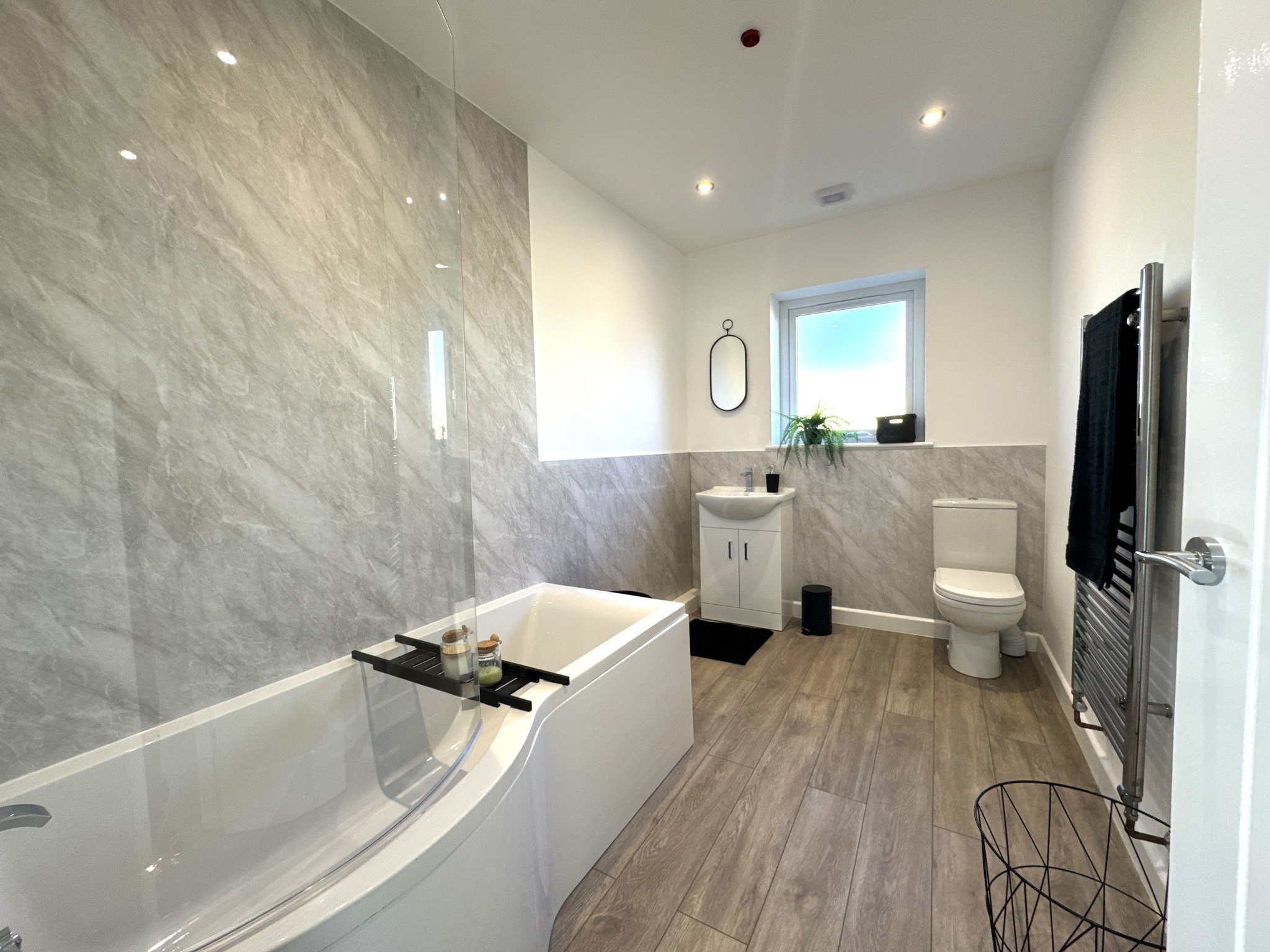 The main bathroom features a large white P bath, grey aqua panelling with overhead shower, wall mounted chrome towel radiator, white toilet and basin unit.