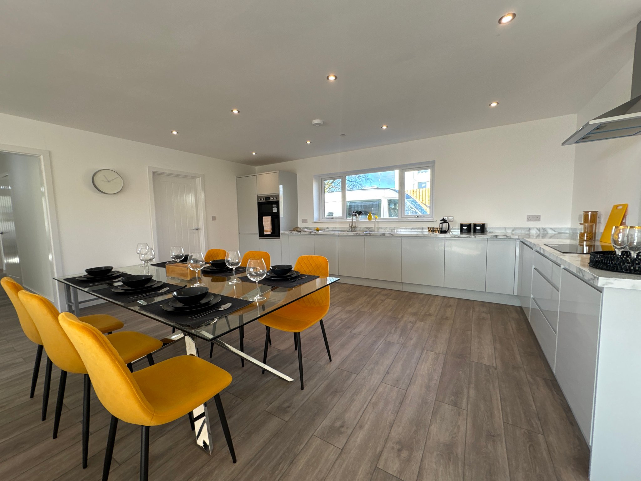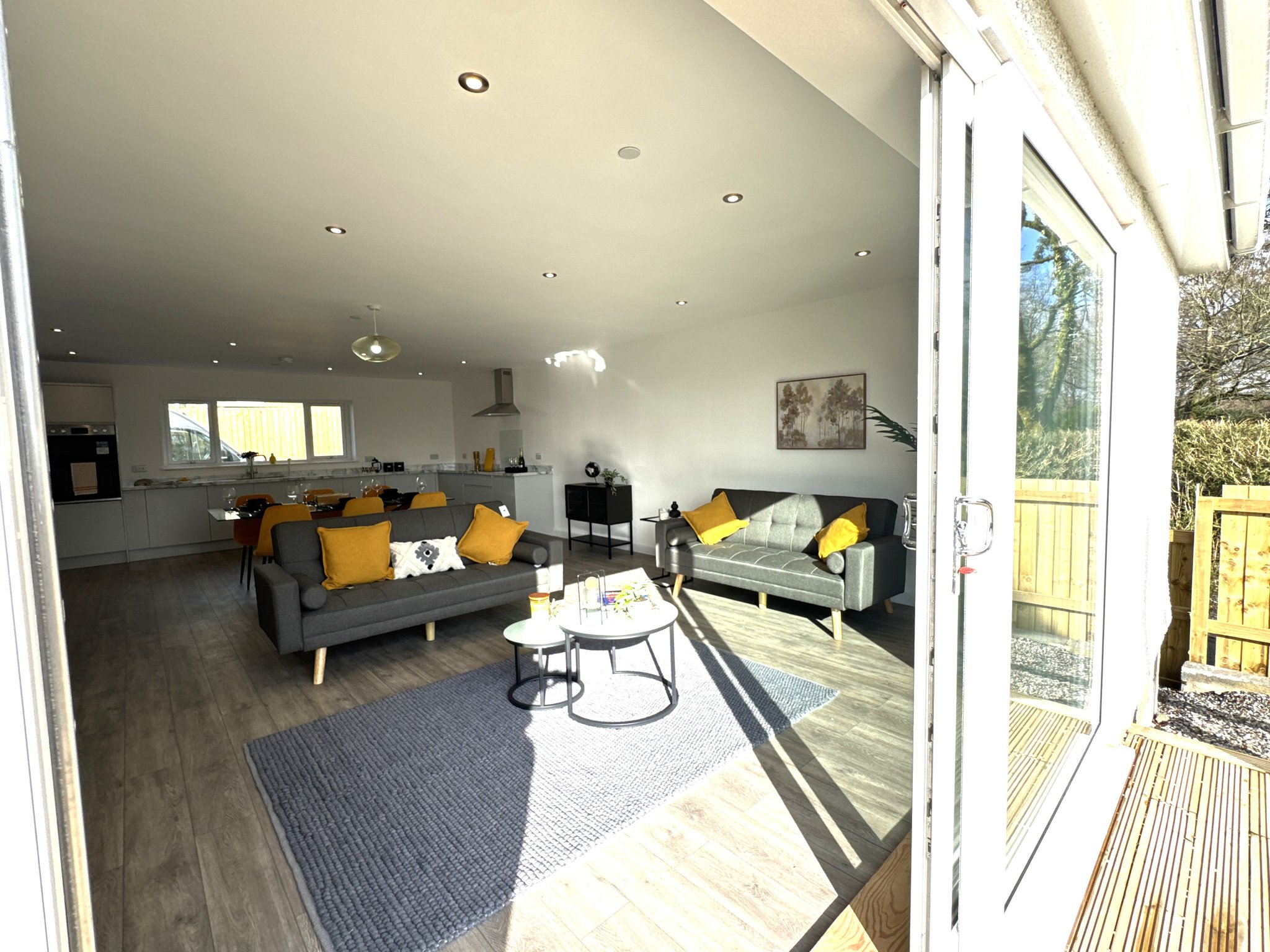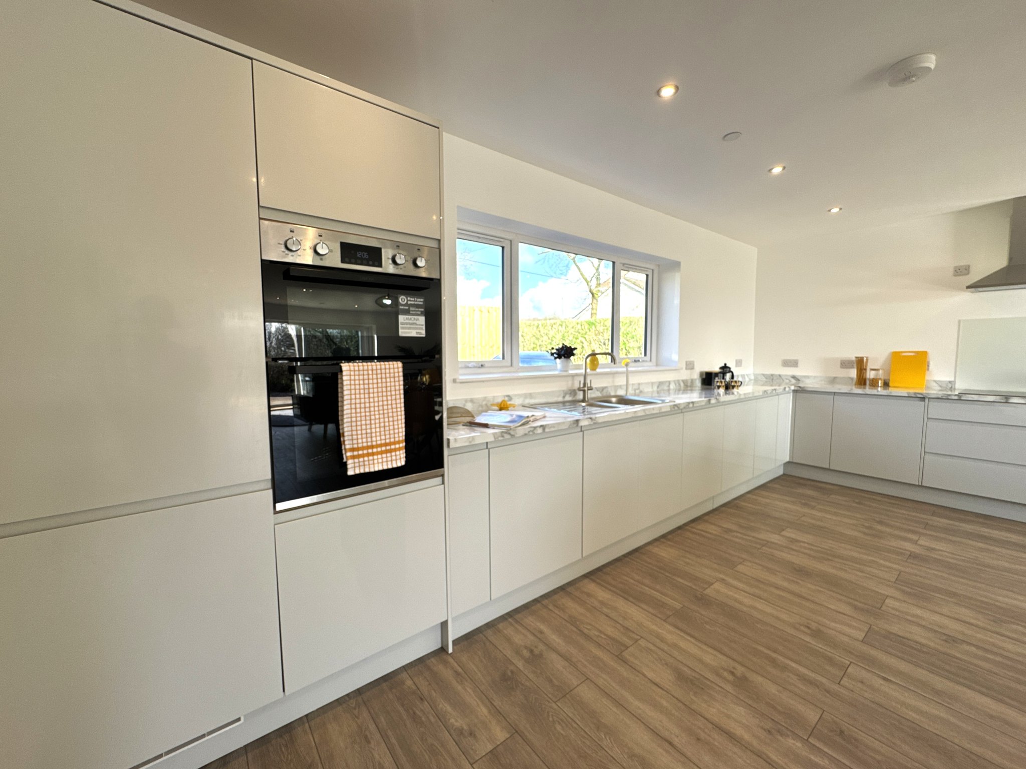Open - concept kitchen living space. The spacious area is the highlight of the house featuring brand new appliances including induction hob, extractor fan, a 1 1/2 stainless steel sink with drainer and mixer tap, integrated dishwasher and fridge/freezer.