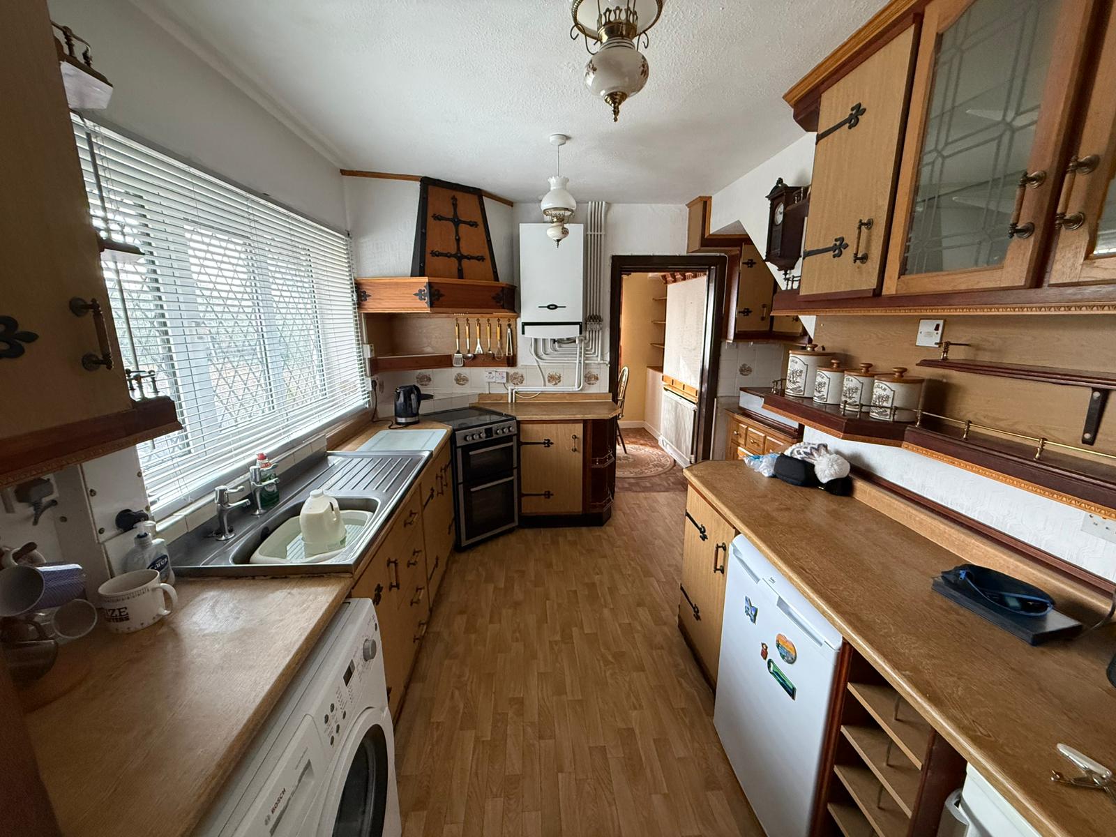 Approx. 3.39m x 3.99m (11' 1" x 13' 1") Fitted base and wall units. Single drainer sink unit. Overhead extractor fan (cooker not included). Baxi wall mounted central heated boiler. Further fitted shelving and china glass fronted cabinet. Plumbed for washing machine. Cupboard under stairs. Part tiled
