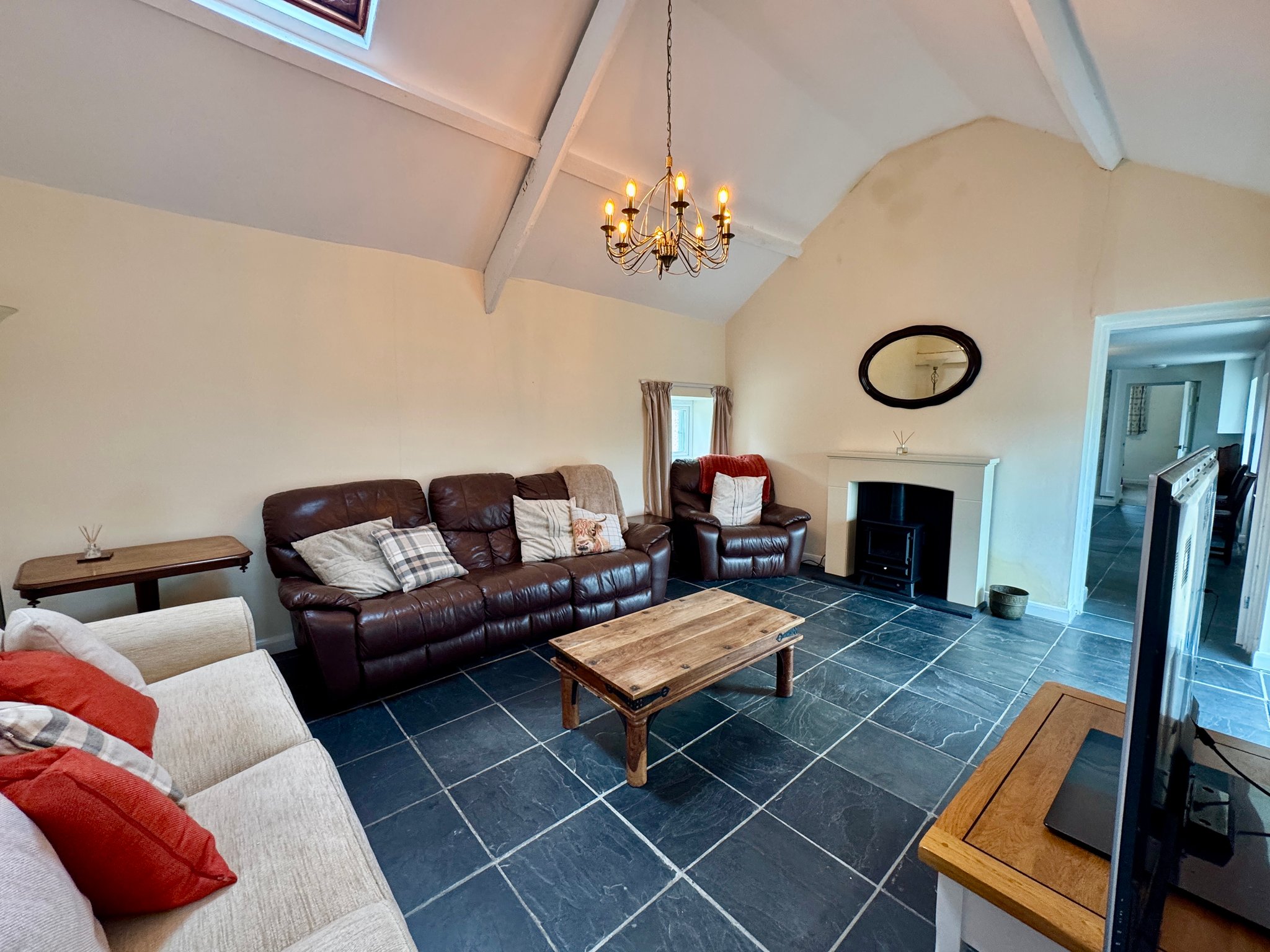 3.82m x 5.22m (12' 6" x 17' 2") Window to front. Window to rear. Feature electric fireplace. Slate floors. Vaulted ceilings and original beams