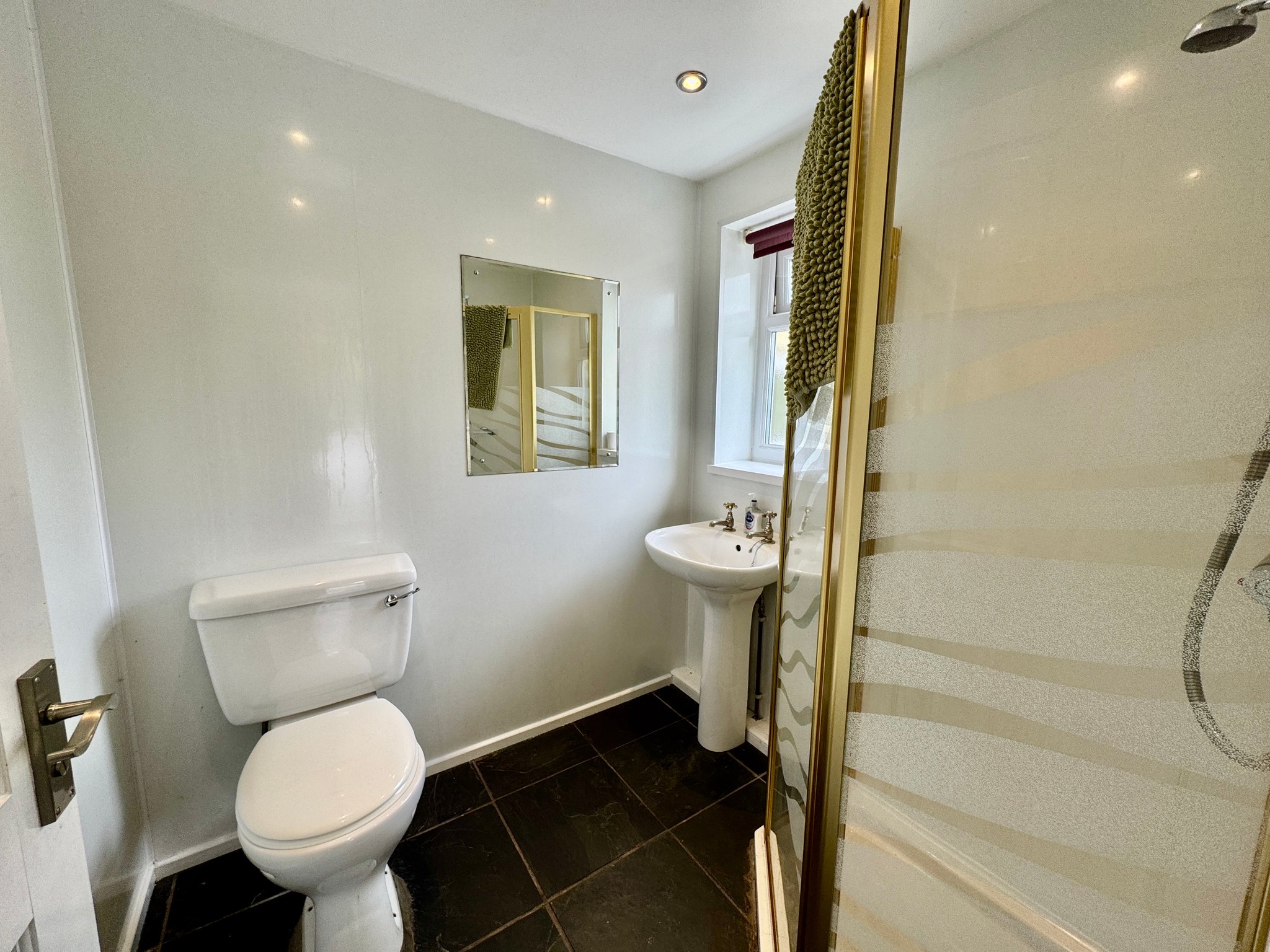 1.9m x 1.78m (6' 3" x 5' 10") Shower cubicle. W.C. Wash hand basin. Window to side. Slate tile effect floor with underfloor heating. Extractor hood