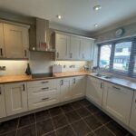 A modern kitchen with base and wall units to include an integrated double oven / grill, electric hob with extractor fan over and dishwasher. Tiled flooring and window to front.