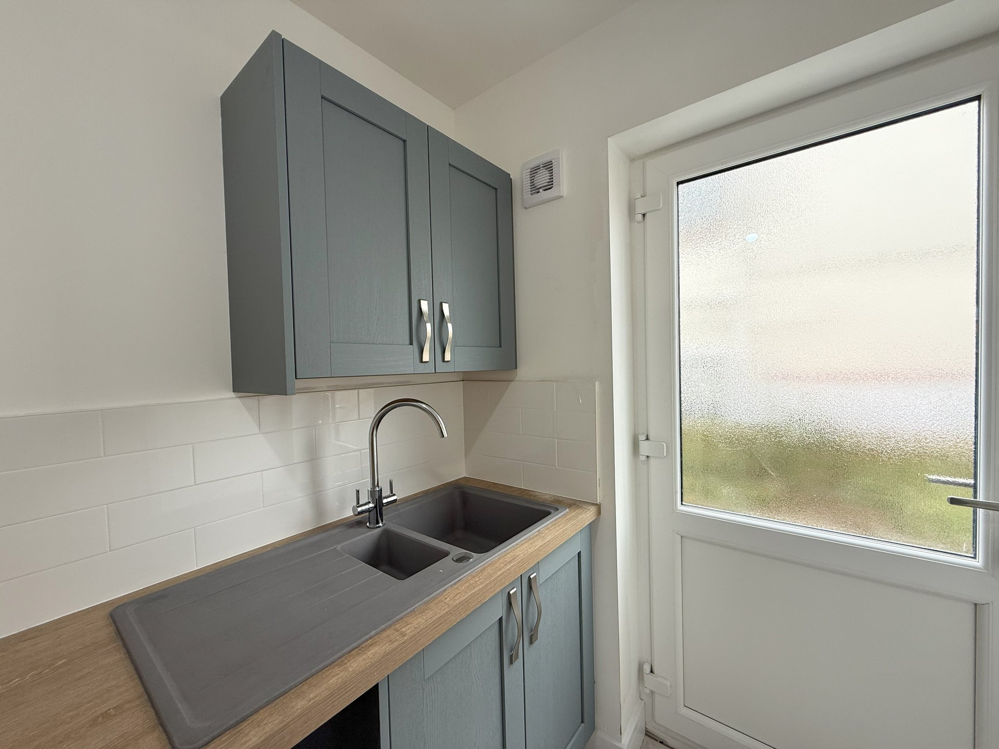 1.71m x 2.15m (5' 7" x 7' 1") Base and wall units. 1.5 sink. Plumbing for washing machine/tumble dryer. Door to side. Tiled flooring