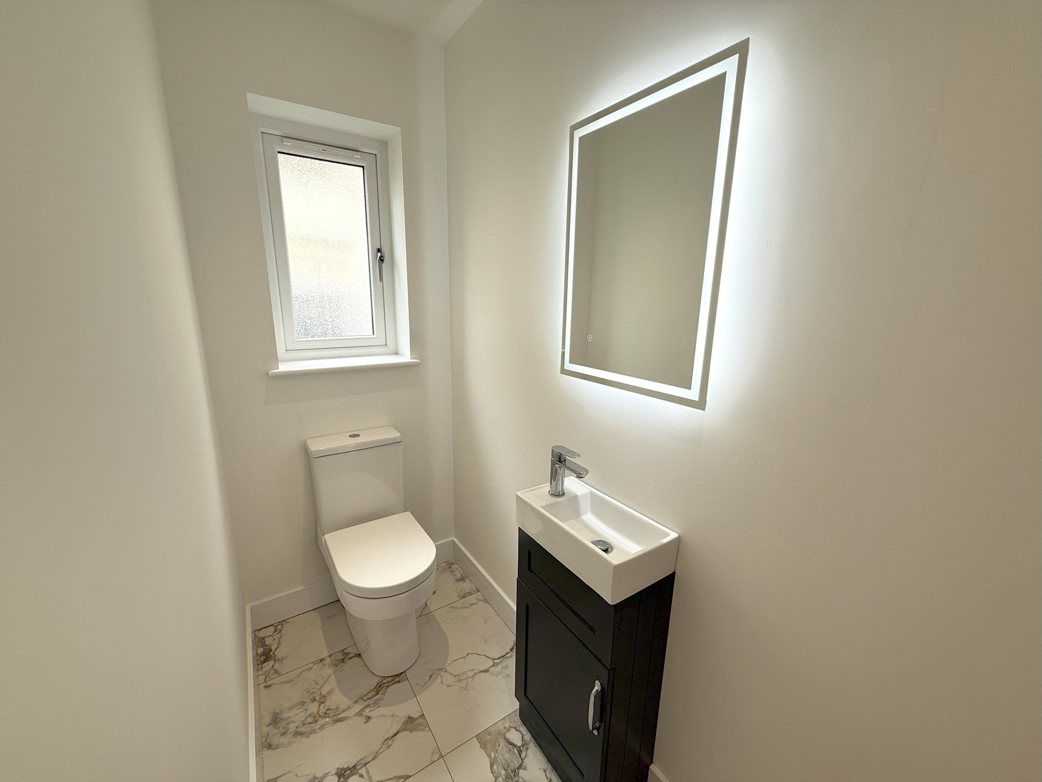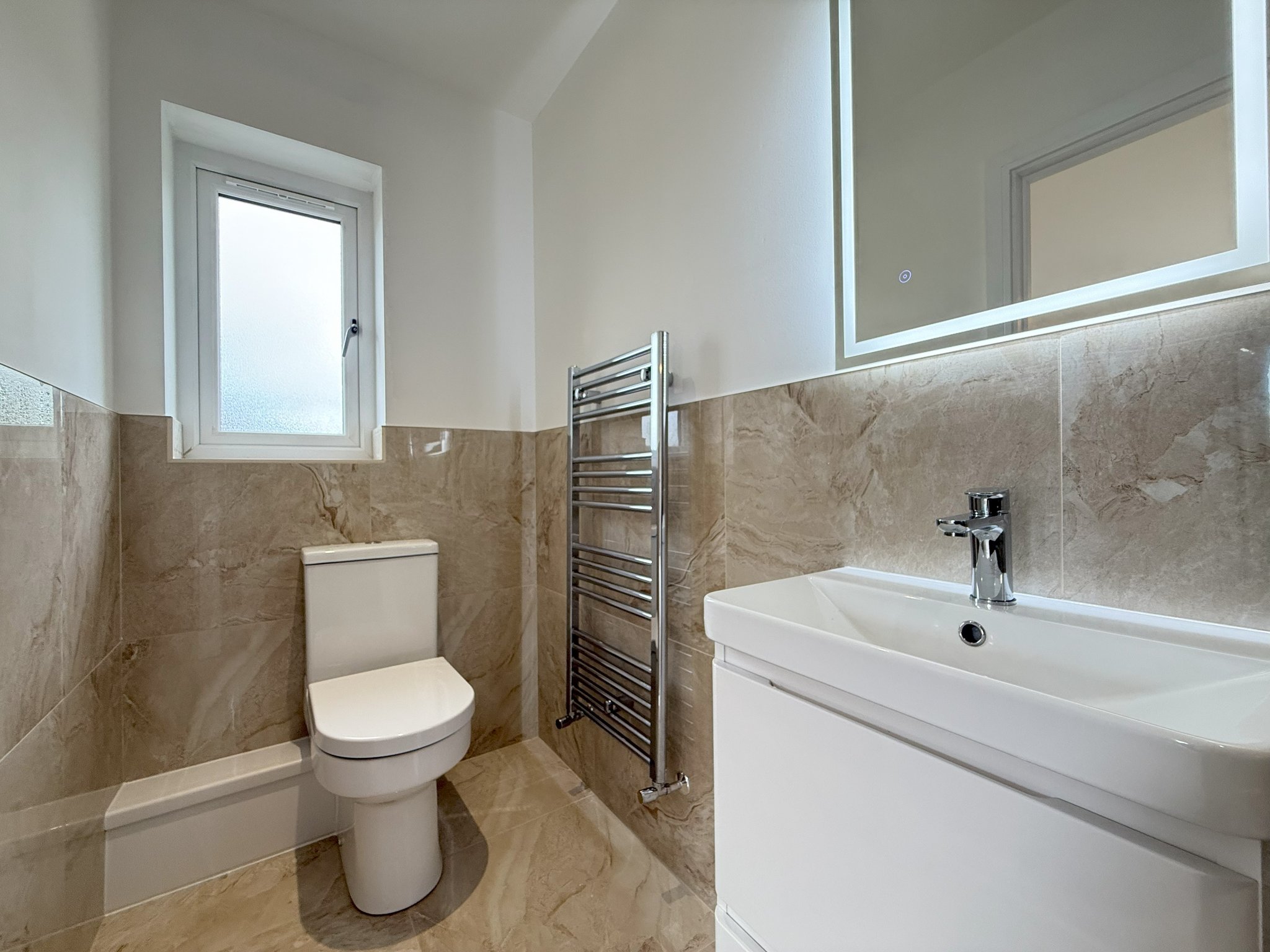 2.15m x 0.98m (7' 1" x 3' 3") WC. Wash hand basin. Mirrored light. Walls tiled. Tiled floor
