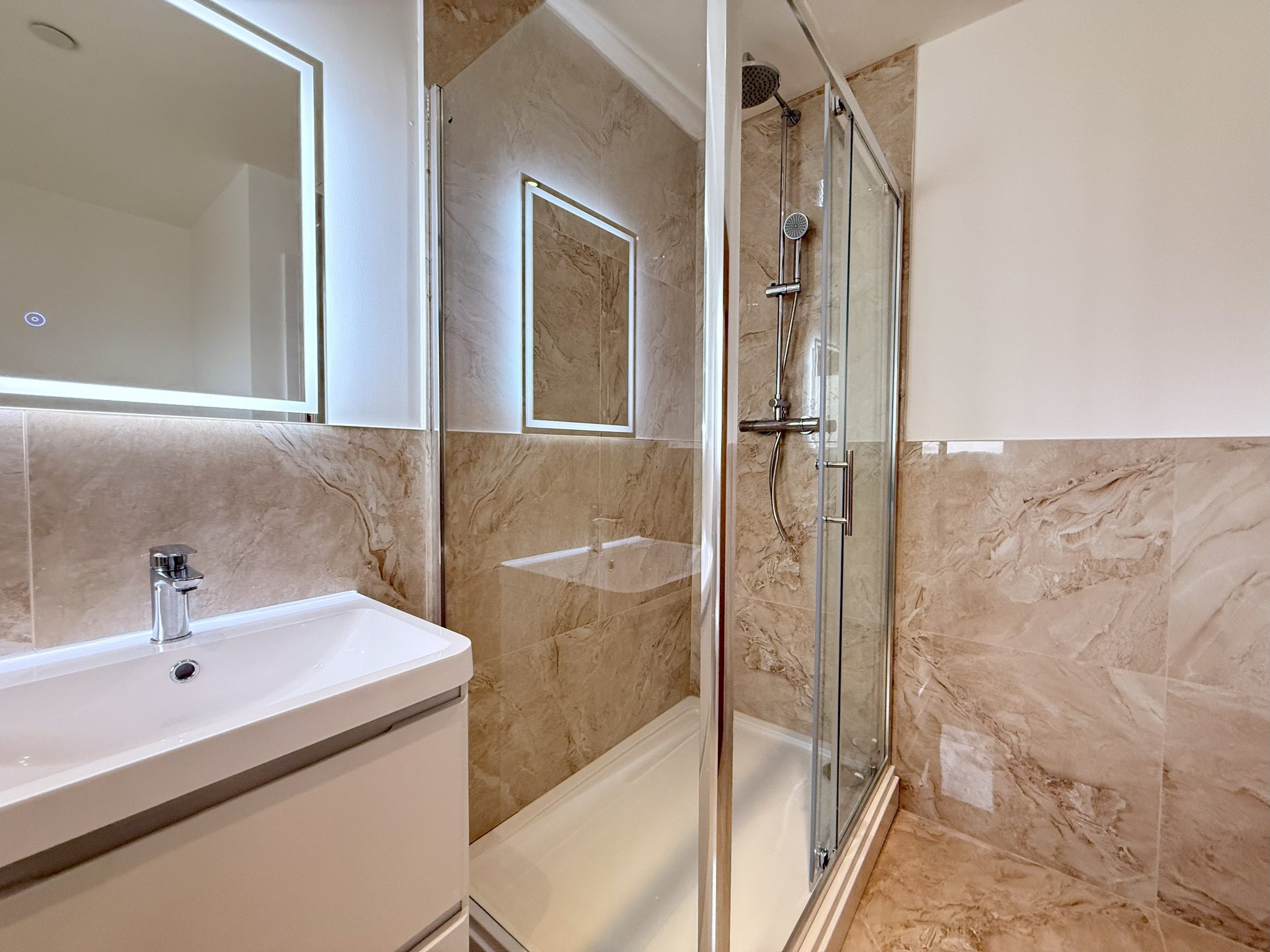 1.20m x 2.04m (3' 11" x 6' 8") Window to side. Tiled floor and walls. W.C. Wash hand basin. Vanity unit. Mirrored light. Double shower. Extractor unit. Towel rail